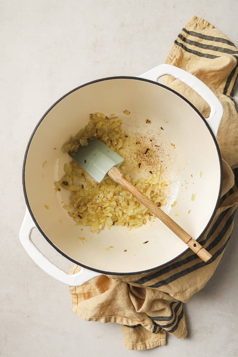 Warmth the olive oil in a dutch oven. When sizzling add the onions and sauté for 3 – 4 minutes on a medium warmth till translucent.